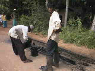 ![]() 舗装工事 ジョロで撒く |